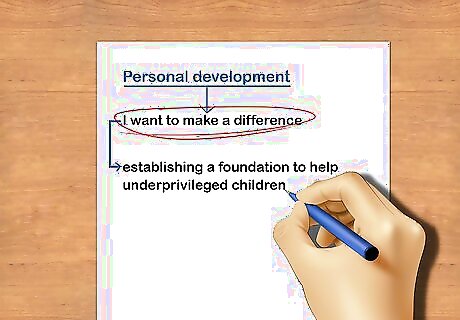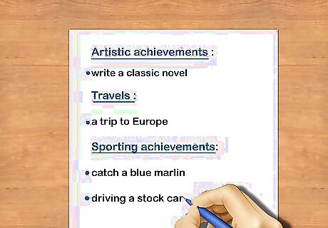 List the different "categories" of achievements you hope to attempt in your life. A few examples might be these: Relationships. Finding your soulmate, having children, seeing your children grown and having children of their own is one train of thought. Sporting achievements. This may include shooting a 70 on a golf course with no handicap, or a hole in one, or it might mean catching a blue marlin, driving a stock car, or pitching a no-hitter. One consideration on this category is being realistic about your ability, and present age. Success in business or work. Many people happily live full lives at a 9 to 5 job shuffling papers, owning a house in the suburbs, and taking the family to the local diner on Friday nights, but this may not be your idea of a goal in life. Look at possibilities, list them, and find out what it will require to achieve them. Philosophical goals. These are a little more difficult to describe, but they may include being a good neighbor, sharing your beliefs, or finding the meaning of life. Your list does not, and probably should not, reflect only material goals. Making a difference. Here, you can really challenge yourself, be it finding a great scientific discovery that ends suffering from a tragic disease, or establishing a foundation to help underprivileged children. Artistic achievements. There are a number of possible goals here, from writing a novel destined to become a classic, to painting a masterpiece. Travels. You may long to take a trip to Europe, Alaska, or the North Pole. You may even want to travel to space, and even though you may never make it there, put it on the list, and see what opportunities arise to make the dream a reality. Do not limit yourself to these categories. They are just meant to give you some suggestions. Instead, let your imagination run wild. Be as creative as you can be.