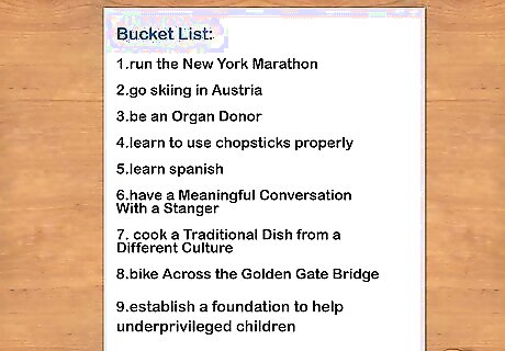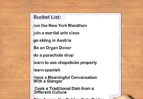 Take your time. Writing a long list of things you want to do before your die can take a while. You do not need to try to finish it in one sitting. Add to your list over months, maybe even years. It never has to be “finished.” Eventually you’ll build a very long list. If you think of something new, take a moment to add it to the list. Your list will grow over time, and you will think of things to add even when you are not deliberately sitting down to add things. This approach will help prevent you from getting frustrated.
