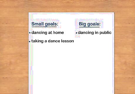Write down some big goals and some small goals. You should think big, but also small. A mix of big and small goals will give you things that you can accomplish regularly. Not every goal has to be something for the far future. Create small goals that can lead you to your bigger goals. For example, dance at home, then take a dance lesson, then go dancing in public. When your small goals lead to your bigger goals, you will lead yourself to long term success. Write something on your list that you can do today, tomorrow, and this week. If you include items you can accomplish in the short term, you will feel like you have created a list you can actually accomplish.