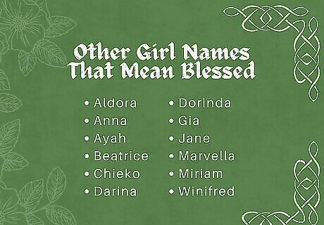There are also plenty of girl names from around the world that mean “blessed.” If you’re not into any of the Irish girl names, consider one of these instead: Aldora: “Winged gift,” Greek origin (feminine). Anna: “God has favored me” or “grace,” Hebrew origin. Ayah: “Sign of God” or “miracle,” Arabic origin. Beatrice: “Blessed” or “bringer of happiness,” Latin origin. Chieko: “A thousand blessings,” Japanese origin. Darina: “Gift,” Slavic origin. Dorinda: “Gift of God,” Greek/Latin origin. Gia: “God is gracious,” Italian origin. Jane: “God is gracious,” Hebrew origin. Marvella: “Miracle,” Latin/French origin. Miriam: “Wished for child” or “beloved,” Hebrew origin. Winifred: “Blessed” or “friend of peace,” Welsh origin.