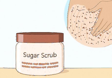 Exfoliate your skin using a sugar scrub. Exfoliating your skin removes dead skin cells, which helps renew your skin. To use sugar scrub, massage it into your skin in a circular motion for about 30 seconds. Then, rinse the scrub away in your shower. Afterwards, apply a moisturizer to rehydrate your skin. Exfoliate your skin once every week or 2. You can make a sugar scrub at home with products you likely already have in your kitchen. If you have sensitive or acne-prone skin, exfoliation might be too harsh for your skin.