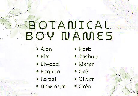 If you’re not in love with any of the flower names, opt for a botanical-inspired name that’s related to trees or plants, instead! For example, baby name expert Tara Collins suggests choosing a name that means tree or refers to a certain type of tree, like Oak or Forest. Some other great ideas include: Alon: “Oak tree,” Hebrew origin. Elm: After the elm tree. Elwood: “Elder tree forest,” English origin. Eoghan: “Born of the yew tree,” Irish origin. Forest: “Woodland,” French origin. Hawthorn: After the shrubs and trees. Herb: After the aromatic plants. Joshua: After the Joshua tree. Kiefer: “Pine tree,” German origin. Oak: After the oak tree. Oliver: “Olive tree planter,” Latin origin. Oren: “Pine tree” or “ash tree,” Hebrew origin. Silas: “Forest,” Latin origin.