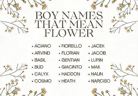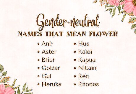 If you don’t want to give your baby boy a traditionally masculine name, there are lots of gender-neutral options to choose from. These names either directly mean “flower” or are related to flowers: Anh: “Flower” or “petal,” Vietnamese origin. Aster: After the flowering plant. Briar: “Thorny bush of roses,” British origin. Golzar: “Flower” or “rose garden,” Persian origin. Gul: “Rose,” Persian/Turkish origin. Haruka: “Spring flower,” Japanese origin. Hua: “Flower” or “blossom,” Chinese origin. Kalei: “Flower garland,” Hawaiian origin. Kapua: “Flower child,” Hawaiian origin. Nitzan: “Flower bud,” Hebrew origin. Ren: “Lotus,” Japanese origin. Rhodes: “Where roses grow,” Greek origin. Sage: After the flowering herb.